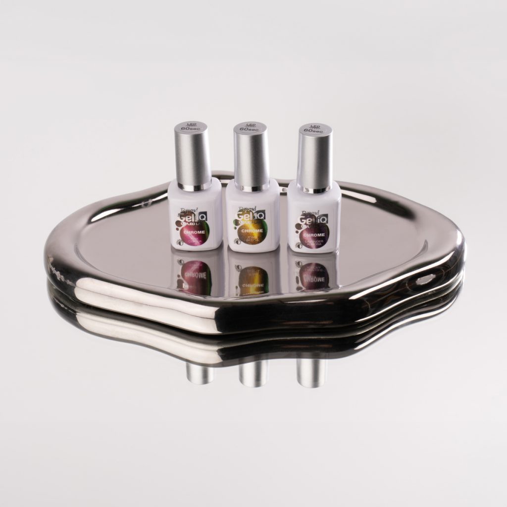 Chrome, Chrome, Chrome. Vi kan simpelthen ikke få nok af Chrome! Oplev magien i en glitrende lak, der skifter farve alt efter, hvilken basefarve du vælger. En mørk base giver et dybt og mystisk look, mens en lys base giver en spejlblank, næsten futuristisk finish. Polér til perfektion – og nyd det!