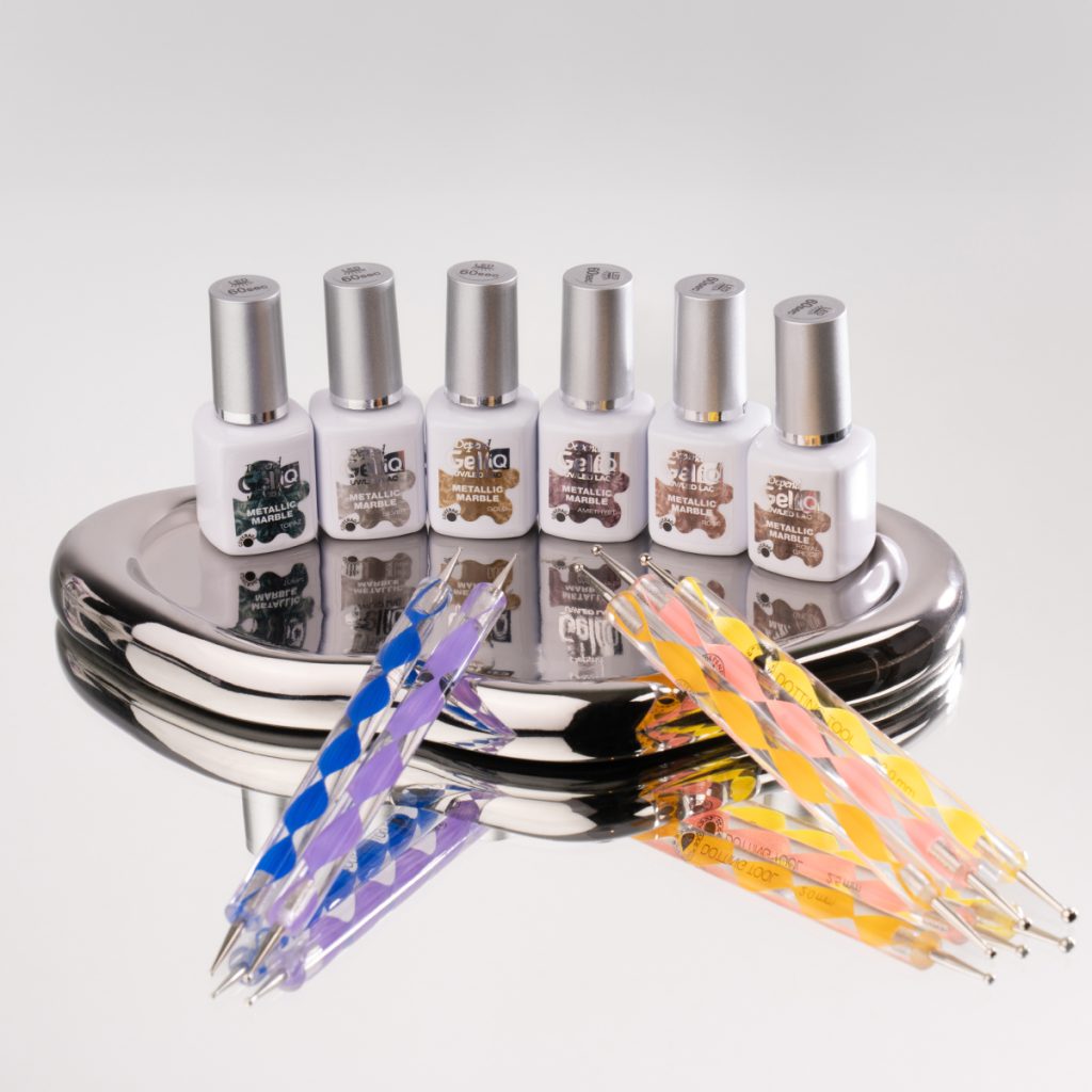 Metallic Marble er til dig, der ønsker en glansfuld Pearl Metallic-finish – eller vil designe unikke mønstre med pensel eller Dotting Tool. Dit valg af basefarve og nuance på effektlakken skaber unikke kombinationer og dybde i hvert design.