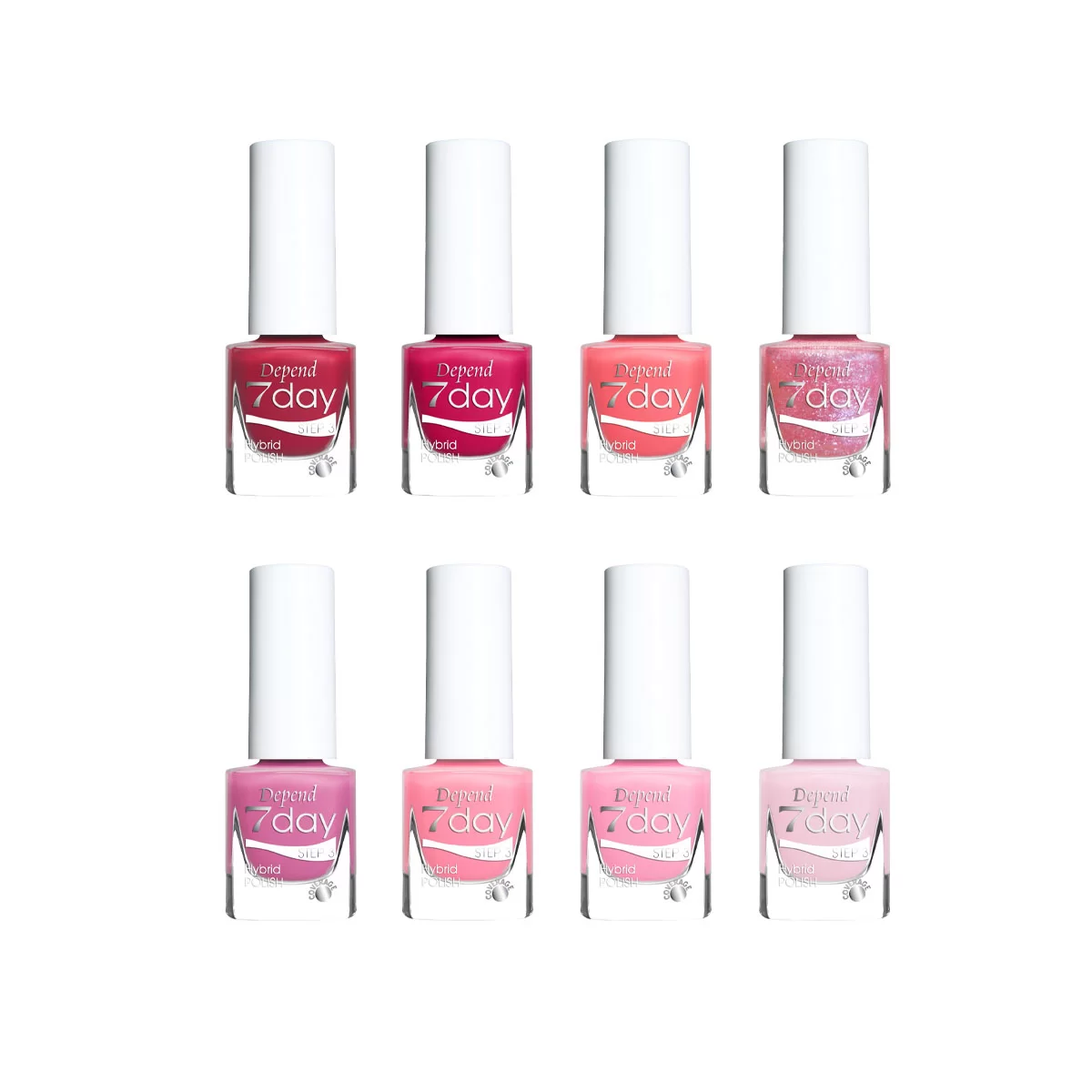 7day er laksystemet til dig, der søger en neglelak med superglans, ekstrem god holdbarhed og ”gel feeling”. Denne hybridformulering holder i op til en uge, er let at påføre, og du tager nemt lakken af med Depend neglelakfjerner. Laksystemet hærder i normal dags-/ lampelys. Depend 7day lak har symboler på flasken så du ved, hvor godt lakken dækker; dækkende, halvdækkende eller transparent.